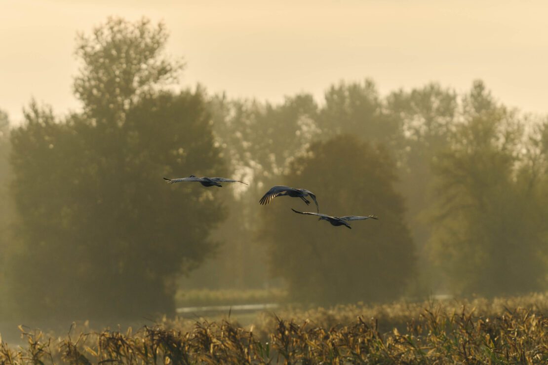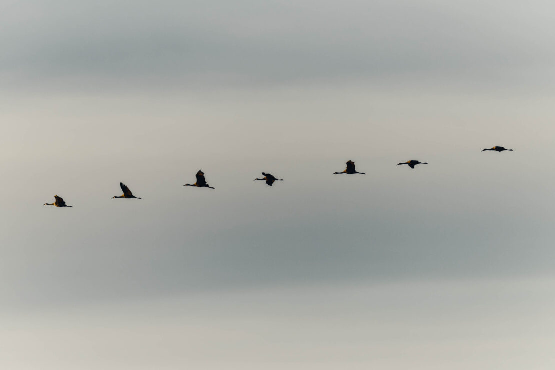 On a crisp October morning I went out to a crane’s landing site in the Vancouver Lake Lowlands with the biggest lens I’ve ever used to photograph the sandhill cranes for Columbia Land Trust. The location is a key stopover point for the cranes during their long distance journey along the Pacific Flyway as they feed, lounge, and roost overnight while also being closely monitored by land trust stewards.