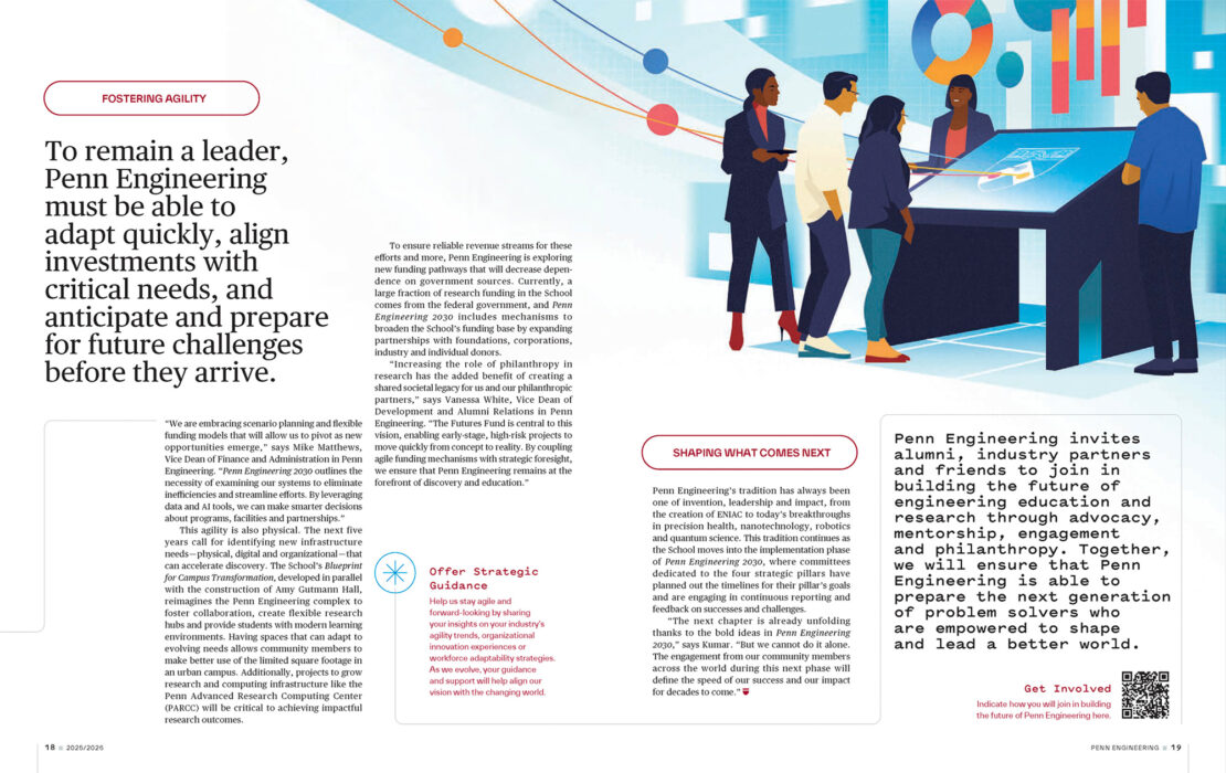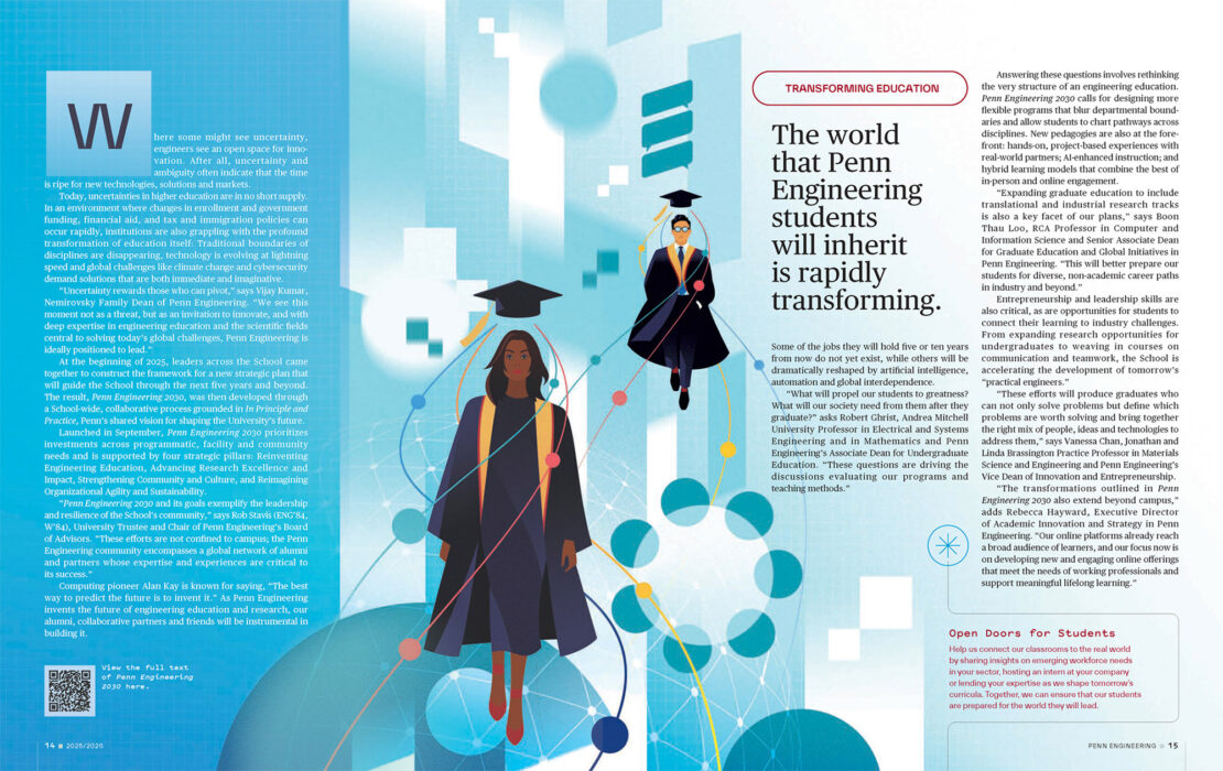 Penn Engineering 2030 is the school’s strategic plan which charts a bold, collaborative path forward in this new era for higher education, positioning Penn Engineering to lead in addressing global challenges through excellence, innovation and partnership.
